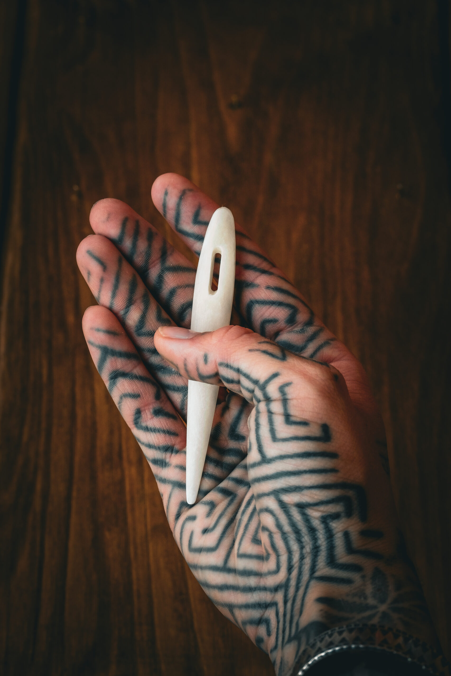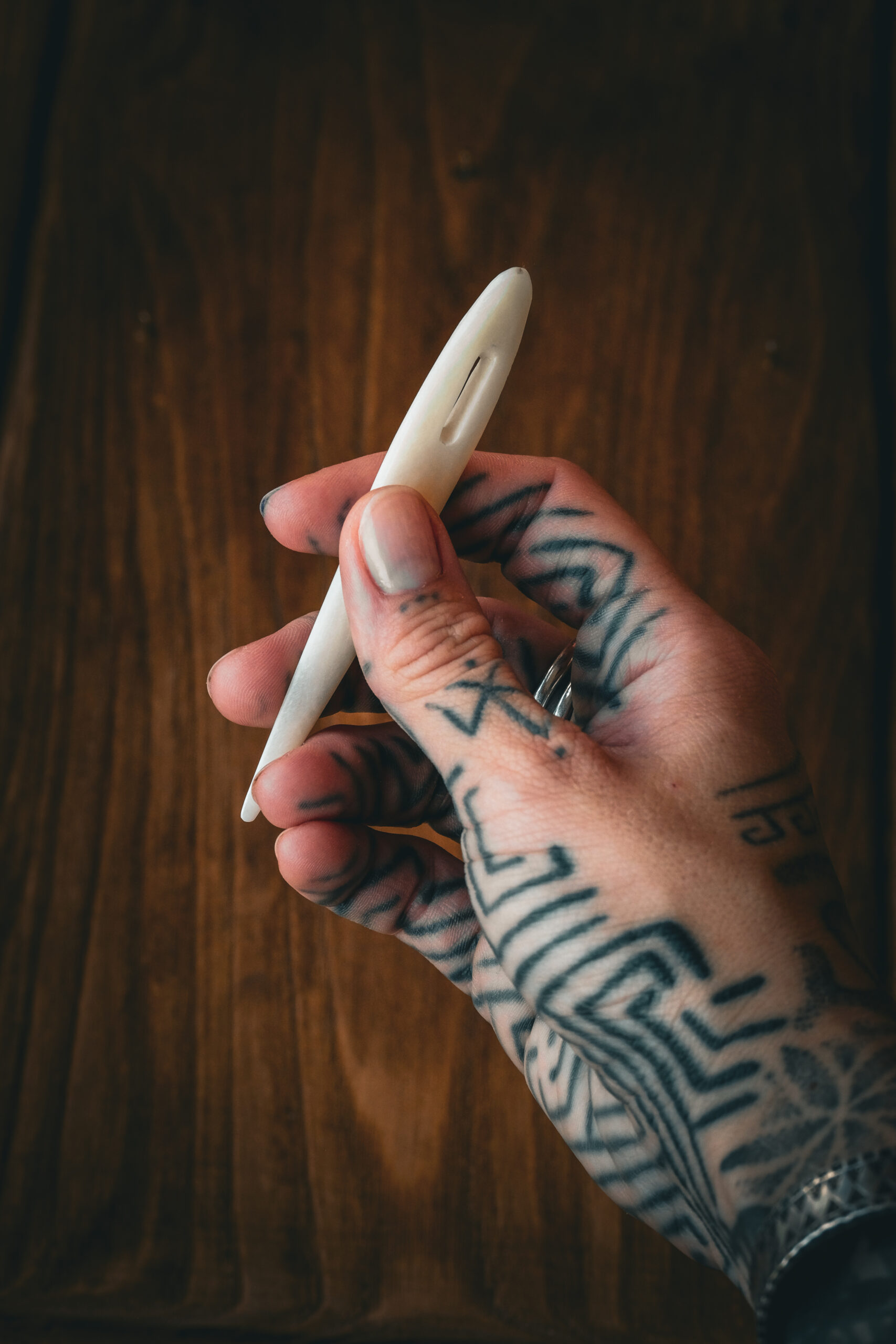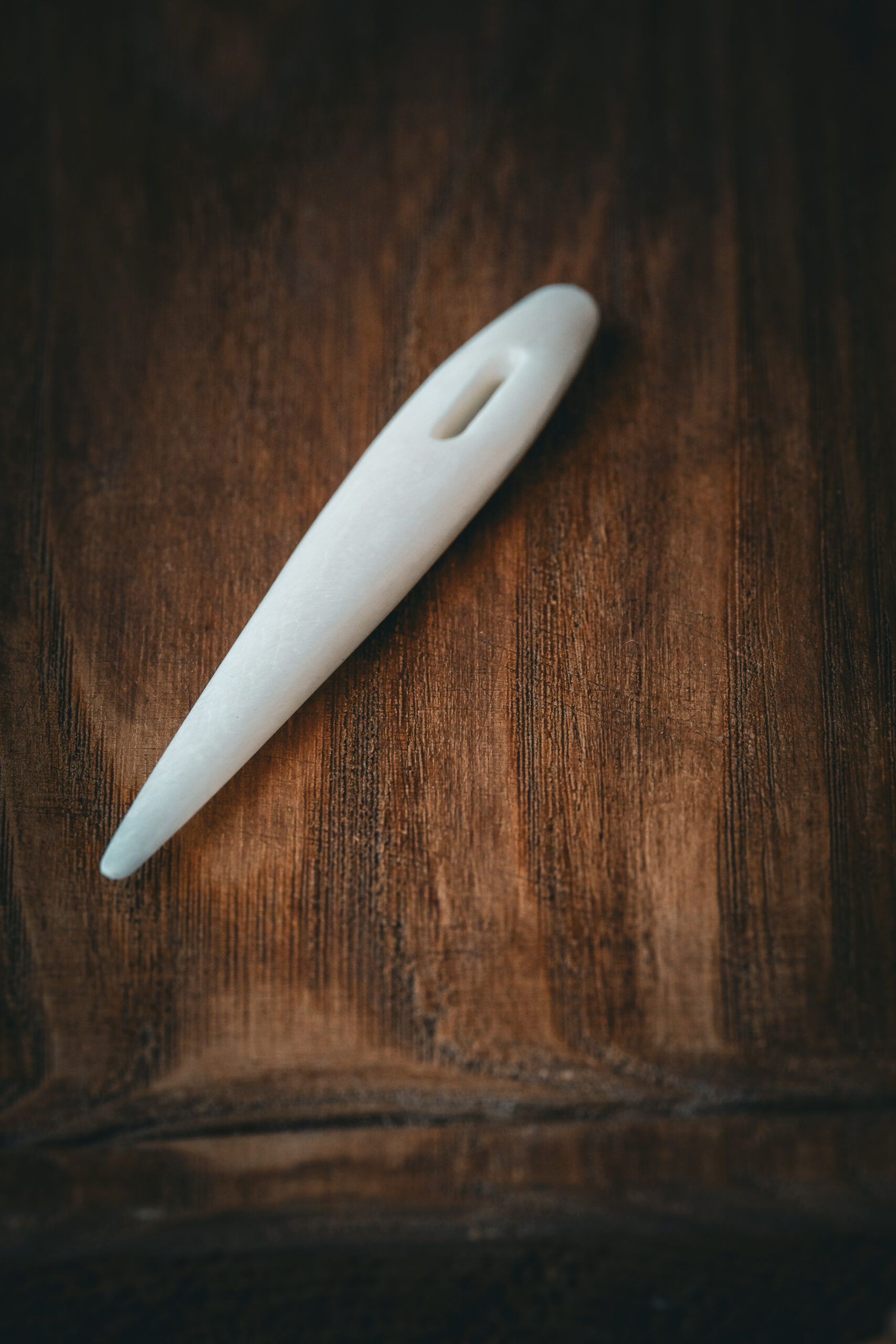 Aguja de hueso de vaca hecha a mano para nalbinding. Es una técnica antigua utilizada para confeccionar calcetines, guantes, gorros, y otros artículos de lana con una sola aguja.